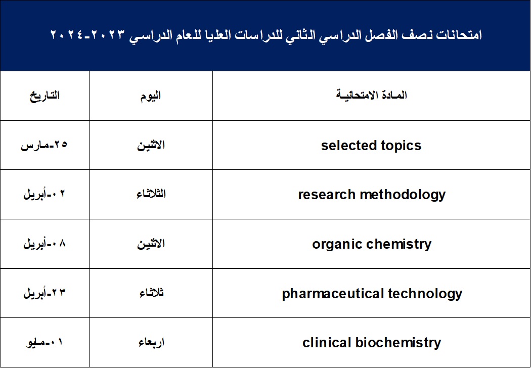 Schedule of examinations for the second half of the semester of graduate study for the College of Pharmacy at the University of Basrah for the academic year 2023-2024
