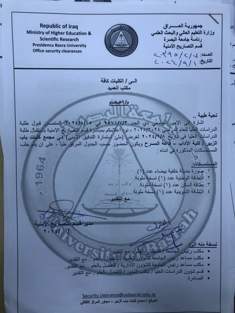 The Security Permits Department officially announces the commencement of its operations to systematically receive all Postgraduate Students admitted for the upcoming academic year (2024 - 2025) in order to complete the fundamentally required institutional procedures.