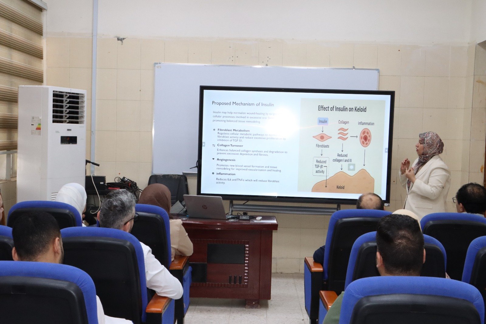 نظم فرع الصيدلة السريرية في الكلية حلقة نقاشية (استخدام جديد وحديث لدواء الانسولين) وتضمنت الحلقة النقاشية محاضرة القتها التدريسية سارة طلال عمران استخدام جديد وحديث لدواء الانسولين. حيث اثبتت أحدث الدراسات 2025 إمكانية استخدامه في علاج الجدرة الجلدية قامت هذه الدراسة باختبار ومقارنة فعالية ثلاثة ادوية لعلاج الجدرة المعاندة (الستيرويد والبوتكس والانسولين وذلك بحقنها موضعيا داخل الجدرة، حيث تم اثبات فعالية الانسولين العالية عند حقنه موضعيا داخل الجدرة في التقليل من بروز وتصلب نسيج الجدرة ومساواته مع النسيج الطبيعي للجلد. حيث يعتبر هذا إنجازاً لتقليل التشوهات الحاصلة نتيجة الجدرة والتقليل من اعراضها غير المرغوب فيها. اوصت المحاضرة بإمكانية عمل بحث تطويري لهذا البحث واخذ عدد أكبر من الأشخاص الذين يعانون من الجدرة لاختبار فعالية الانسولين عليهم فكلما زاد حجم العينة ازدادت الثقة بفعالية وتفضيل الانسولين على غيره من الأدوية الشائعة لعلاج هكذا ندب جلدية.