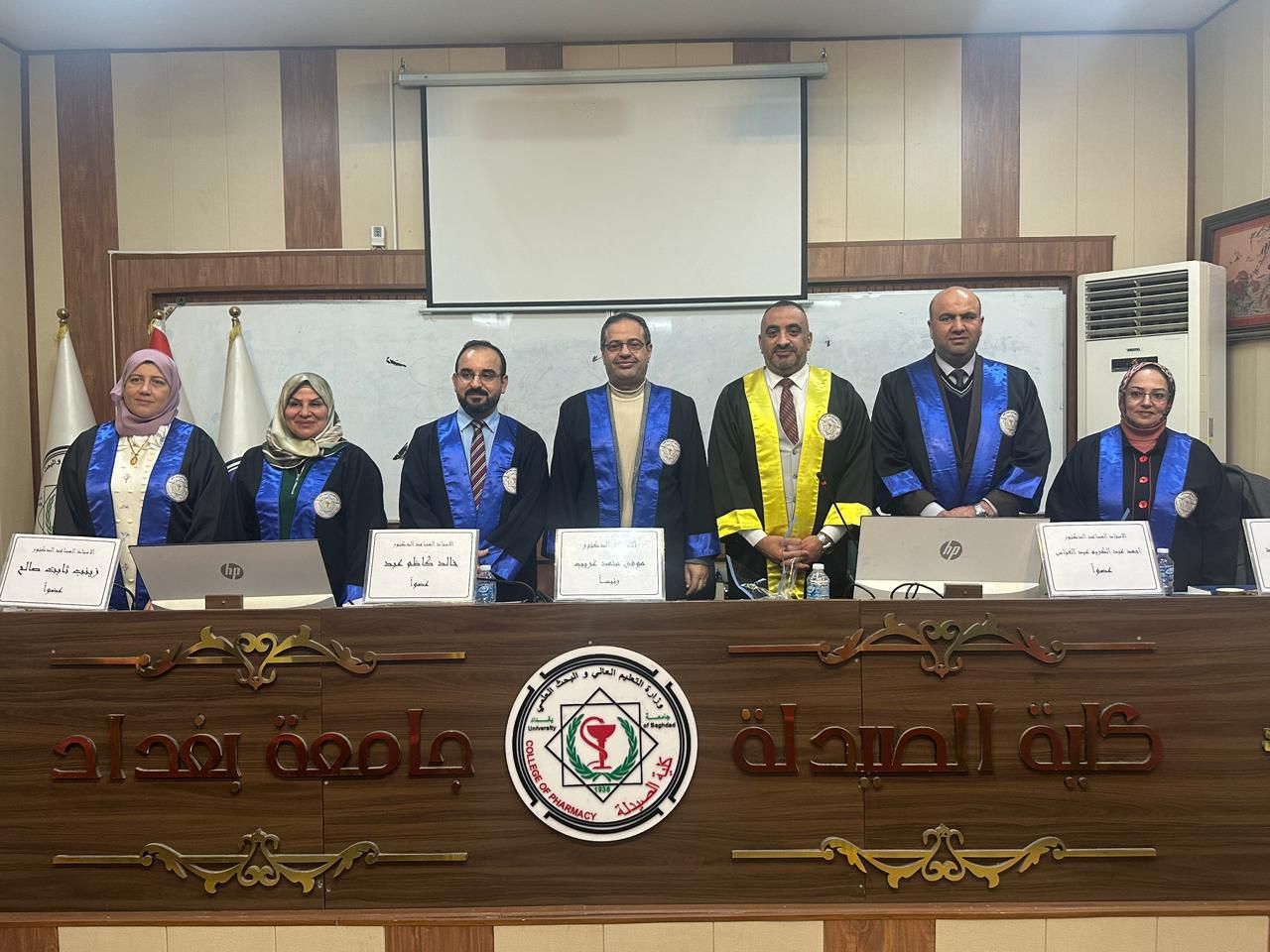 A faculty member from the College of Pharmacy is participating as a member of a doctoral dissertation discussion committee at the University of Baghdad.